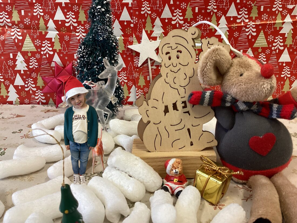 Met de tablet gingen we aan de slag om foto's te maken. We mochten ons eigen kersttafereel ontwerpen in groep. Belangrijk was dat we 'binnen het kader' bleven. Zodat alles mooi op de foto kon. We experimenteerden en probeerden. Juf Leonie nam een foto van onszelf met een kerstmuts en toverde het vervolgens in het kersttafereel.